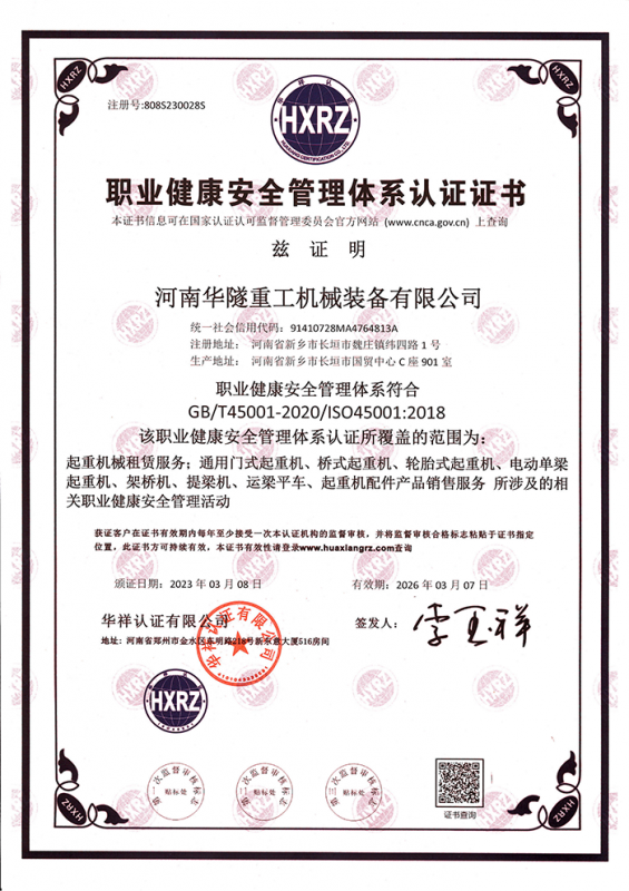 河南華隧重工機(jī)械裝備有限公司主要從事通用門式起重機(jī)、橋式起重機(jī)、電動(dòng)單梁起重機(jī),輪胎式起重機(jī)、架橋機(jī)、提梁機(jī)、遠(yuǎn)梁平車、鋼絲繩電動(dòng)萌蘆、卷?yè)P(yáng)機(jī)、起重配件制造、銷售:起重機(jī)械租賃、安裝和維修,起重設(shè)備園收,機(jī)械設(shè)備維修,鋼結(jié)構(gòu)工程承包,橋梁工程及技術(shù)咨淘服務(wù),銷售五金制品、機(jī)電設(shè)備:建設(shè)工程監(jiān)理,建設(shè)工程設(shè)計(jì),各類工程建設(shè)活動(dòng),建筑勞務(wù)分包,建筑物折除作業(yè),施工作業(yè),工程管理服務(wù),土石方工程施工,裝如發(fā)運(yùn)。  公司已通過(guò)IS0國(guó)際質(zhì)量、環(huán)境、健康與安全三合一標(biāo)準(zhǔn)認(rèn)證,特種設(shè)備制造許可證和特種設(shè)備安裝改造維修許可證。擁有完熟的質(zhì)量管理體系。嚴(yán)格的管理制度,強(qiáng)大的生產(chǎn)能力和先進(jìn)的檢測(cè)手段,在保證產(chǎn)品質(zhì)量的同時(shí),也具備了極強(qiáng)的市場(chǎng)競(jìng)爭(zhēng)力。  公司堅(jiān)持科技創(chuàng)新為理念,產(chǎn)品質(zhì)量為核心,注重信譽(yù),建立了減信可靠、快捷、思速。便利周到的售后服務(wù)網(wǎng)絡(luò)。  我們擁有的技術(shù)專家和技術(shù)服務(wù)隊(duì)伍為客戶提供充善的售前技術(shù)支持和全天候的售后服務(wù)體系,讓您無(wú)后顧之憂,享受一站式的超值服務(wù)。  “華隧重工,伴您成功“是華隧重工永遠(yuǎn)的宗指,真被的希望與各界朋友攜手并進(jìn)。共創(chuàng)輝準(zhǔn)!